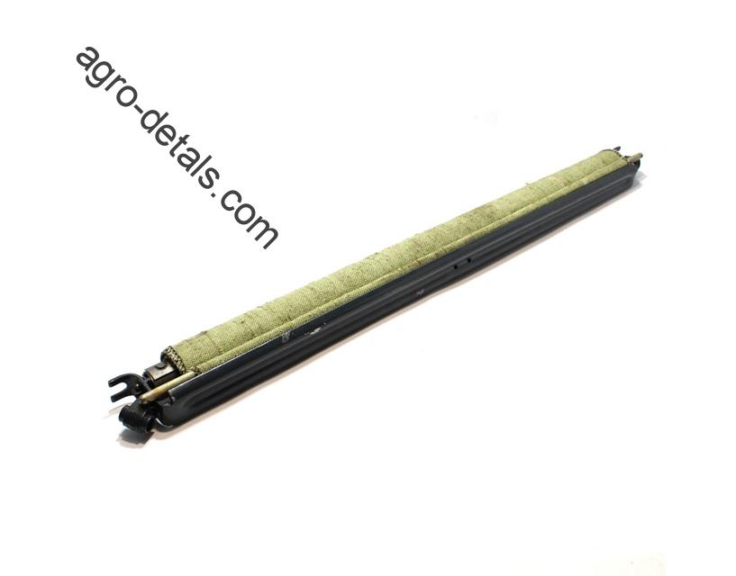 Шторка радиатора 125.08.012 защитная дизельного двигателя СМД-60,СМД-62,СМД-72 тракторов Т-150,Т-151,Т-156,Т-17221,Т-17021,Т-157,Т-150-05-09-25 производства Харьковского тракторного завода ХТЗ.Жалюзи и шторка служат для регулирования потока воздуха, проходящего через радиатор, в целях поддержания заданного температурного режима охлаждающей жидкости и теплового состояния двигателя. Шторка или жалюзи монтируются перед фронтом радиатора.Принцип регулирования состоит в том, что жалюзи или шторка перекрывают поперечное сечение всасывающей фронтовой поверхности перед радиатором, и количество воздуха, проходящего через радиатор, уменьшается.В большинстве конструкций жалюзи и шторки прикрываются и открываются водителем с помощью тросового или рычажного привода.На тракторах расход воздуха регулируется установленной перед фронтом радиатора шторкой. Шторка выполняется из прорезиненного полотна, намотанного на барабане. Внутри барабана монтируется устройство сматывания полотна при прекращении воздействия на рычаг управления. Нижний конец полотна крепится к оси. Барабан вместе с полотном подвижен и может занимать верхнее положение, когда полотно полностью закрывает фронтальную плоскость радиатора, предотвращая поступление воздуха к сердцевине радиатора, и нижнее — когда полотно полностью намотано на барабан и располагается в нижней плоскости радиатора. Прикрывая частично или закрывая полностью радиатор, шторка регулирует поток воздуха через воздушный тракт. Управление шторкой тросовое из кабины оператора. ☎+380954442877,☎+380636896755,✅agro-detals.com