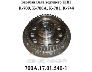 Барабан правый 700А.17.01.540-1 в сборе ведущего вала коробки перемены передач КПП колесного трактора К 700, К 700А, К 701, К 702, К 744 производства ПТЗ. Устанавливается на вал ведущий 700.17.01.011-3 коробки передач трактора К-700. Снаружи на корпусе барабана расположены шлицы в которые входят диски 700А.17.01.038-2 и 700А.17.01.037-1. Изготовлен из высокопрочной стали 33ХС способной переносить большие механические нагрузки в процессе работы коробки передач на тракторе. Применяется на всех серийных моделях тракторов выпускаемых заводом изготовителем и его аналогах.
